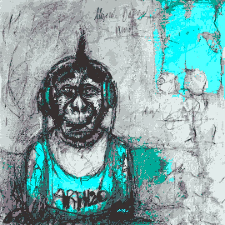 In this unique digital artwork, vivid turquoise and stark black contrast boldly at 76.2 x 76.2 cm. The stylized monkey, with exaggerated features and headphones, stands out against an abstract backdrop. I used pixel art techniques to enhance quirky details, but I noticed a slight pixelation in one area. Light dances across the composition, adding depth and excitement. A hand-crafted digital original waiting to bring life to your game room. This piece was inspired by an unexpected street performance that caught my eye, merging music with city energy. It embodies a playful spirit. Print this 76.2 x 76.2 cm artwork on metal for a centerpiece that commands attention. It’s perfect for anyone who loves quirky and dynamic art. I'm excited to share it with you!