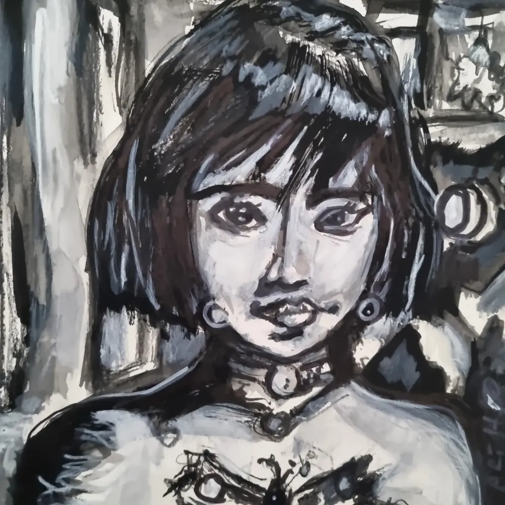 A captivating monochrome painting of a girl with distinct features.