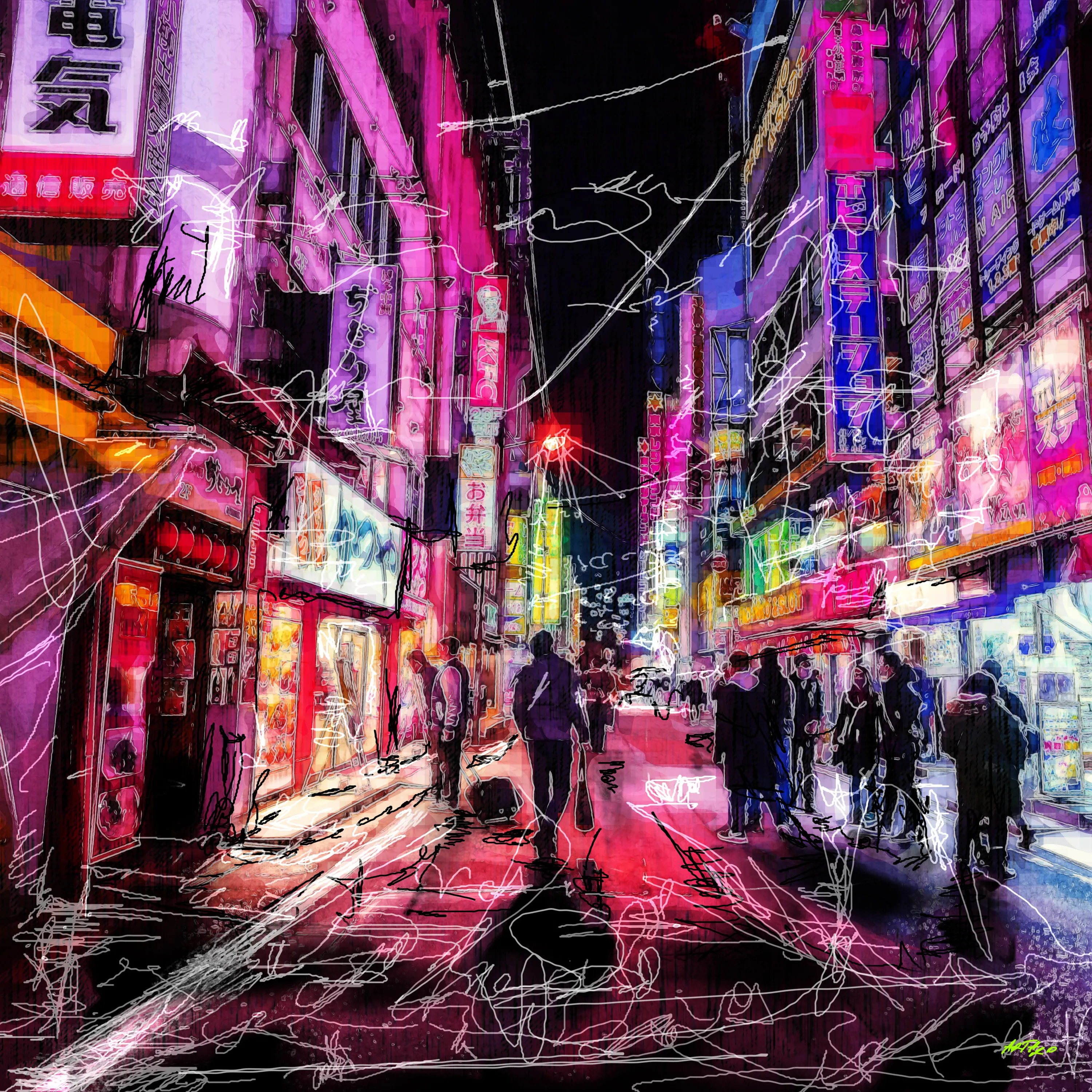 In the heart of the city, under the cloak of night, a group of silhouettes emerge. Bathed in the glow of the magenta city lights, they seem to dance along the rhythm of the urban symphony. They are but fleeting shadows amidst the towering structures, their stories whispered to the cold, concrete pavement. The city, with its veins of electricity, breathes life into this scene. It's a blurry, ethereal image, each figure a ghostly apparition, a testament to the transient nature of city life. Every step resounds with the pulse of the city.